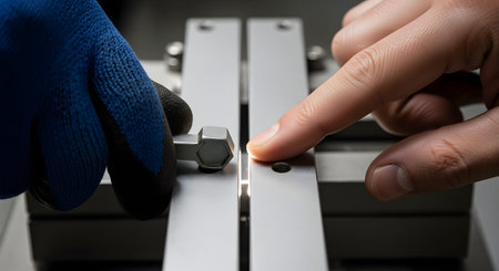 A close-up of a worker's hands, one gloved and one bare, inspecting a precision metal component using a gauge tool. The image focuses on manufacturing quality control, engineering accuracy, and industrial production.