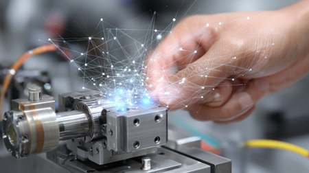 A close-up view of a hand engaging with advanced technology, showcasing the interaction between human and machine in a modern industrial environment.