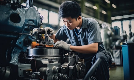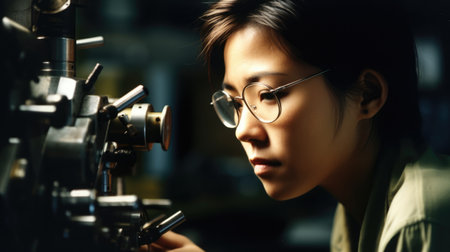 Machinist Female Asian Middle-Aged Operating machine tools in a manufacturing setting, producing precision parts. Generative AI AIG22.