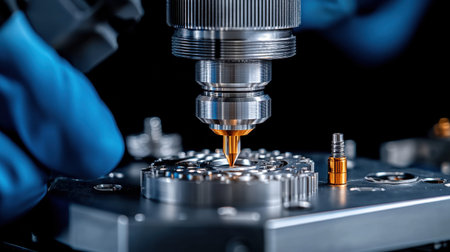 A close-up view of a precision engineering component, showcasing intricate metal textures and detailing, ideal for industrial and manufacturing contexts.