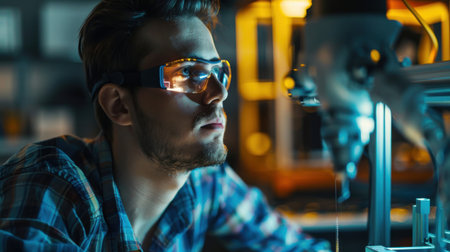 A young man wearing safety glasses intently on a complex machine in a factory setting. The machine is illuminated by bright blue lights, creating a dramatic contrast with the dark background. The man's focused expression suggests he is deeply engaged in his work.