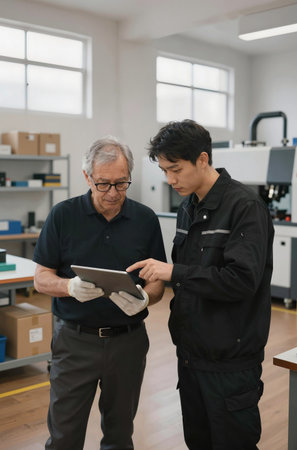 Industrial engineers workers working and checking machine factory