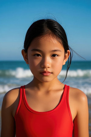 Girl wearing red swimsuit at the beach