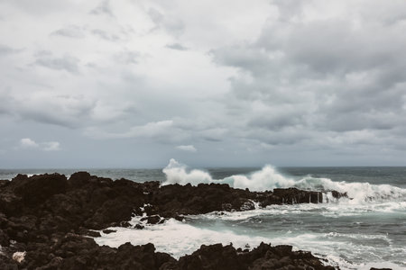 Azores, Big waves crashing over black volcanic rock on the Atlantic Ocean in the coast of Sao Miguel island in the Azores, Portugal