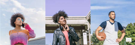 Happy multiracial young people wearing headphones, bright collage, panorama