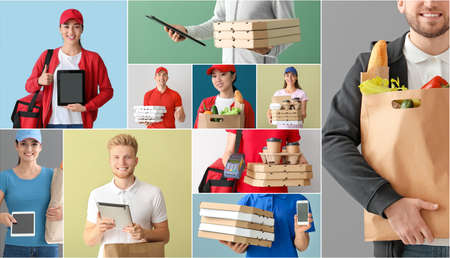 Collage with cropped images of young smiling women and men isolated over colored studio backgrounds.