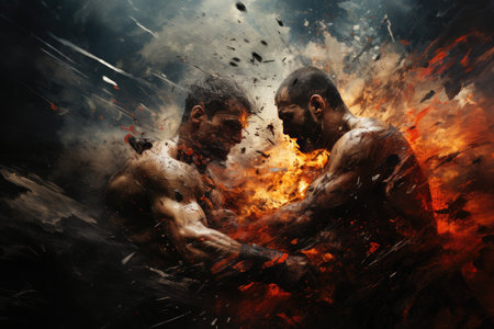 Portrait of two professional mma fighters fighting in the smoke. Mixed media
