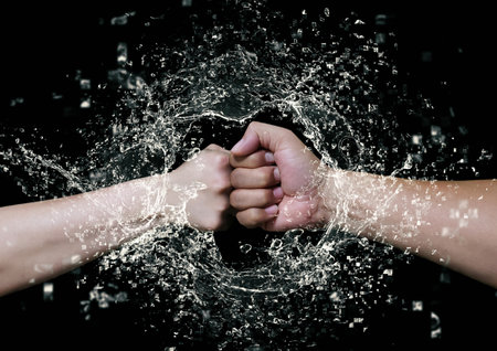 Two men rivalry, closeup of male face. Muscular men forces. Muscular hand. Strong fist knuckle.