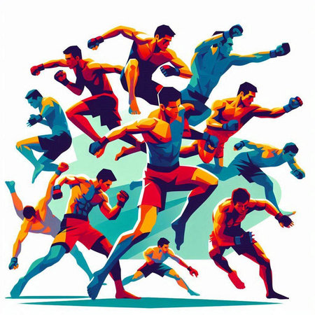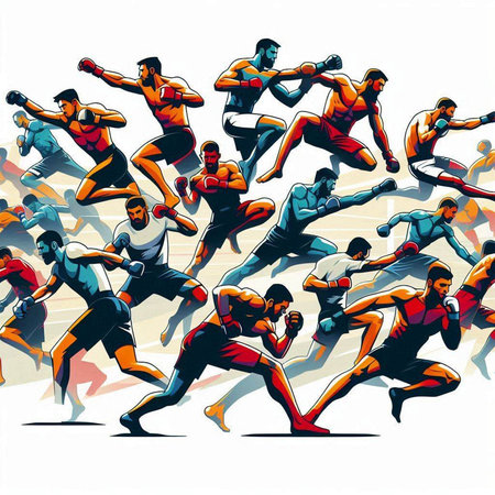 A lively blur of speed and passion as boxers spar in a colorful haze of motion and emotion on a blurred background of cheering fans.