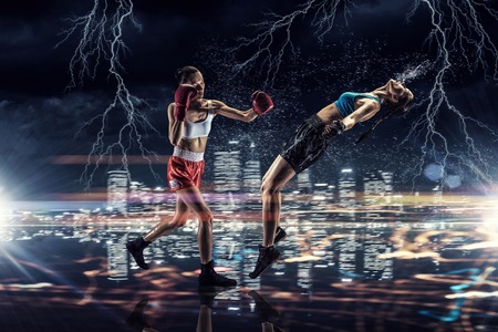 woman boxing straight blow. self defence strength training and female fighter concept.