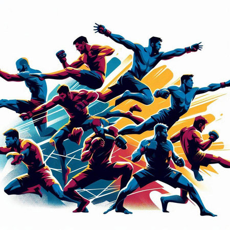 Two martial artists engage in a dynamic sparring match, showcasing skill and technique against a dramatic red backdrop.