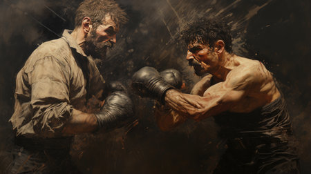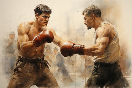 Boxing: Two fighters exchange blows in the center of a boxing ring, under the spotlight's glare. Generated with AI