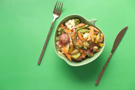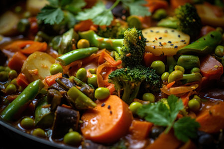 A vibrant and colorful vegetable stir-fry with a medley of fresh ingredients, steam rising in a captivating presentation. Perfect for healthy meals.