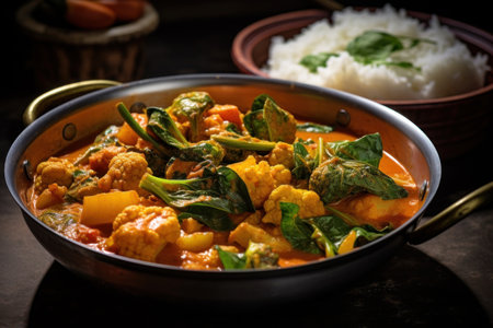 A close-up of a spicy and fragrant Indian curry, simmered to perfection in a traditional clay pot and served alongside fluffy basmati rice, showcasing the bold flavors and authentic of Indian cuisine
