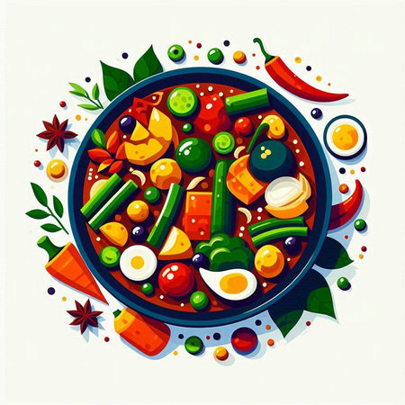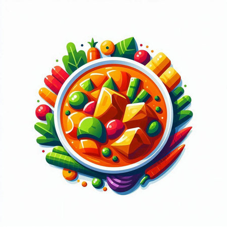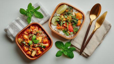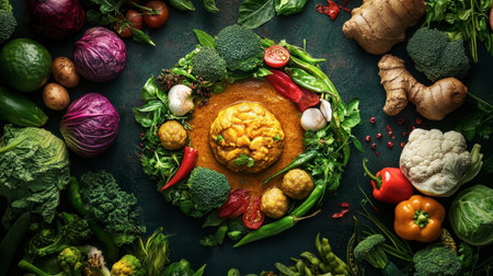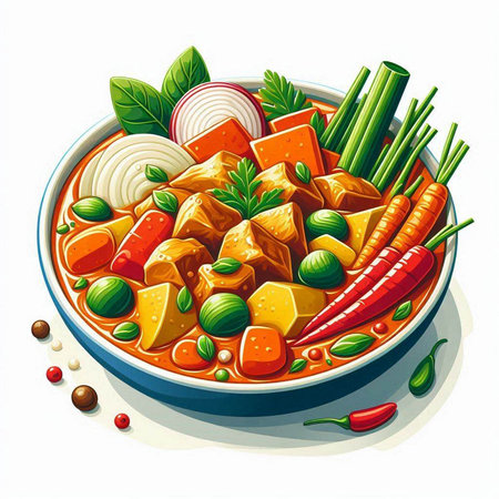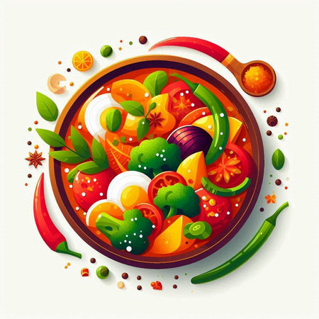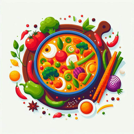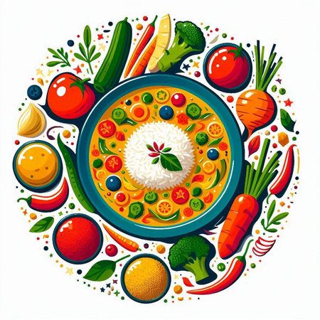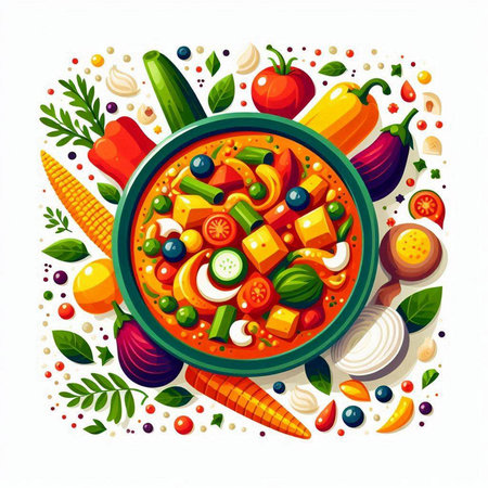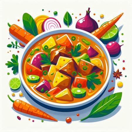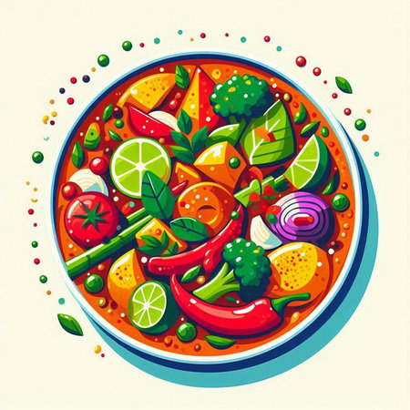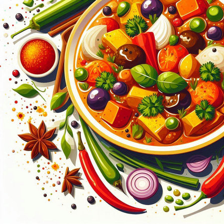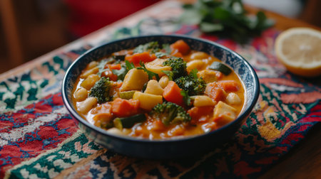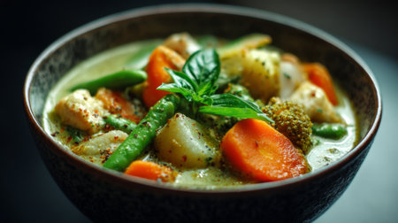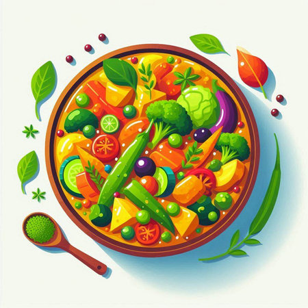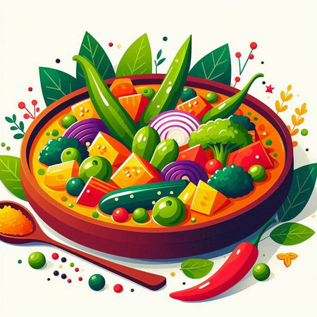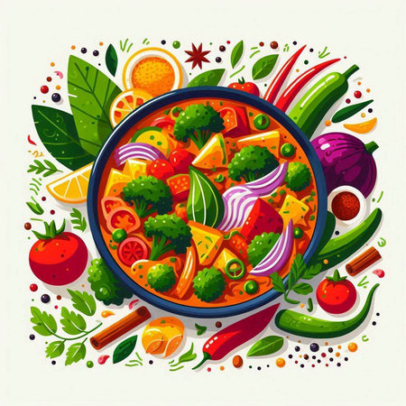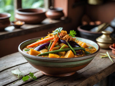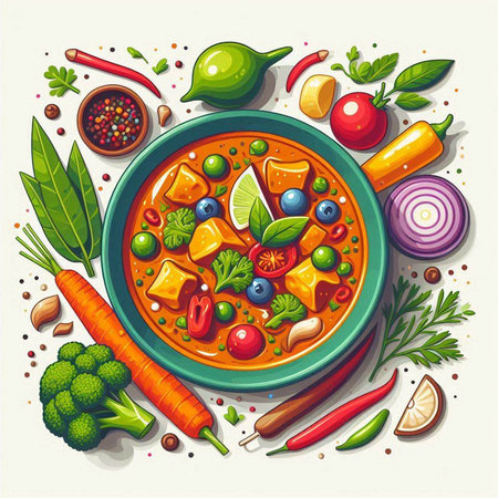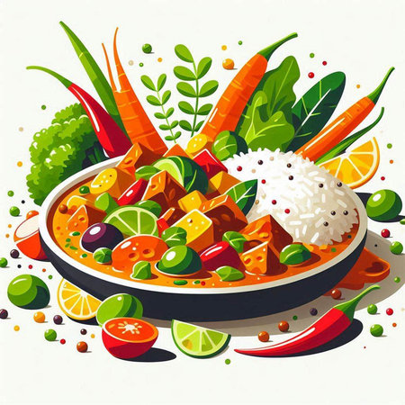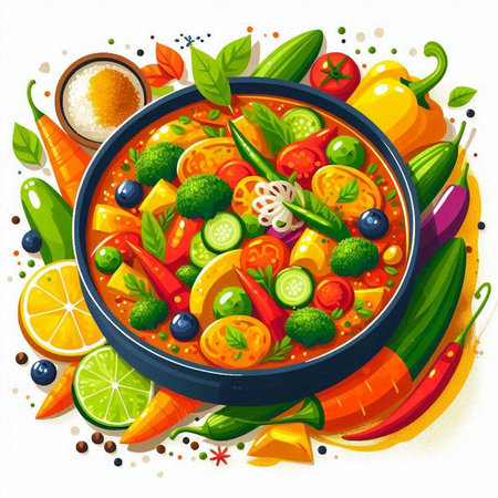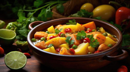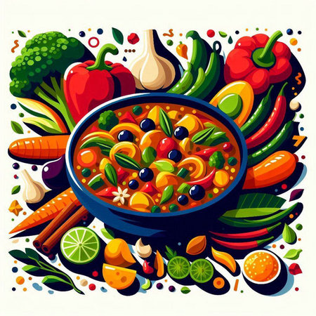 A vibrant vegetable curry in a rustic bowl, surrounded by fresh ingredients like herbs, peppers, and lime. Perfect for showcasing healthy cooking.