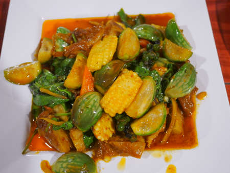 Hot and spicy with fried pork mixed with eggplant leaf very famous of Thai food