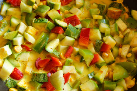 Fried vegetables in sauce cooked on pan. View from above. Vegan or vegetarian concept.