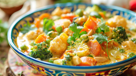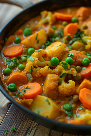 Close-up of a colorful bowl of vegetable korma curry with mixed vegetables in a creamy coconut sauce