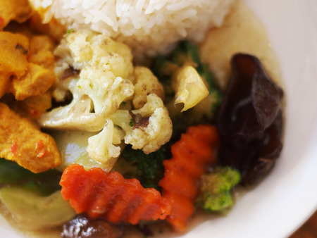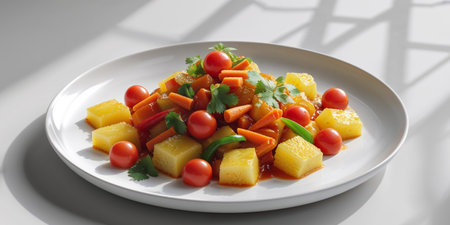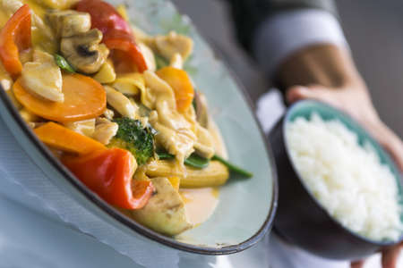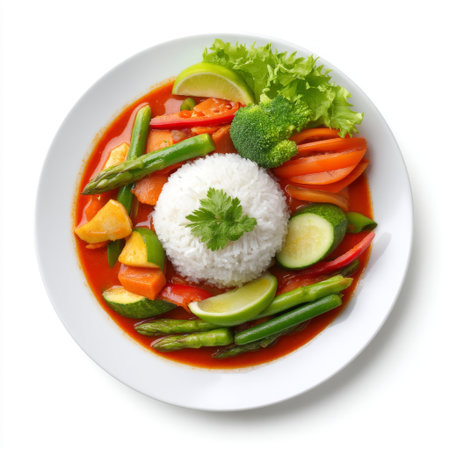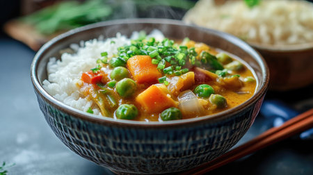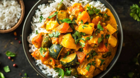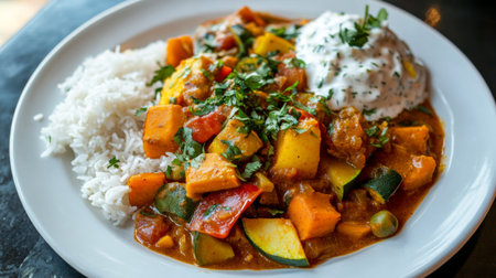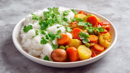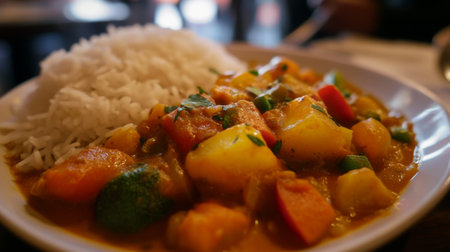 A vibrant plate of colorful vegetable curry paired with fluffy white rice, showcasing fresh ingredients and appealing presentation in a cozy dining atmosphere.
