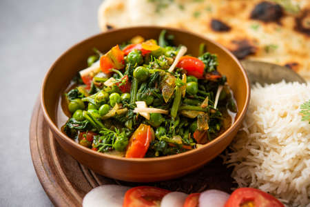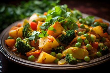 Aloo Gobi matar is a famous Indian curry dish with potatoes and cauliflower and green peas, selective focus