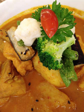 A bowl of mutton curry noodle mutton or mee kari kambing with stone wall insight. Famous and another food innovation from Malaysia