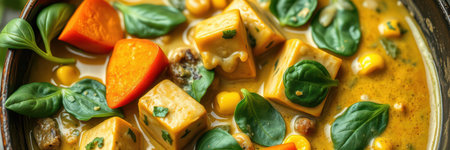 A Yellow Veg Thai Curry with Tofu and vegetables in black bowl at dark slate background. Vegetarian Thai Curry with tofu, zucchini, bell pepper, spinach, carrot. Thai Food. Indian vegetable curry