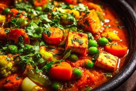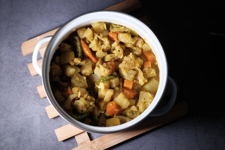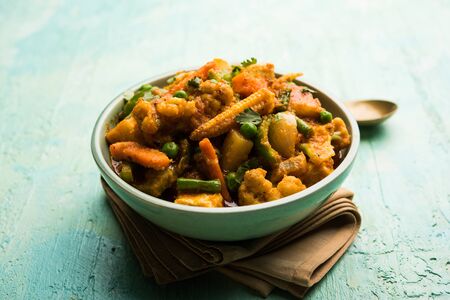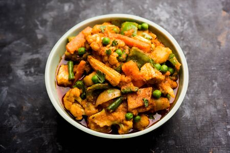 Mix vegetable curry - Indian main course recipe contains Carrots, cauliflower, green peas and beans, baby corn, capsicum and paneer/cottage cheese with traditional masala and curry, selective focus