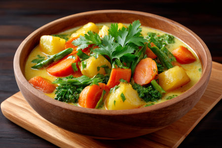 Warm vegetable curry in a wooden bowl, featuring carrots, potatoes, and green beans