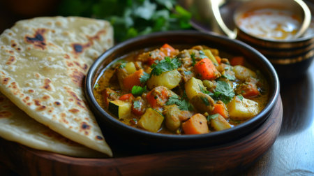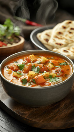A close-up view of a steaming bowl filled with colorful vegetable curry garnished with fresh herbs. Naan bread and a side dish complement this delicious meal on a wooden table.
