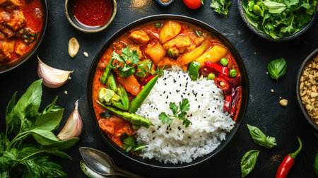 A top-down view of a traditional Thai meal featuring a bowl of hot steamed rice, accompanied by colorful curries and garnished with fresh herbs.