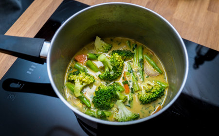 Detailed view of a pot with a simmering curry, surrounded by fresh spices and ingredients on a vibrant kitchen countertop