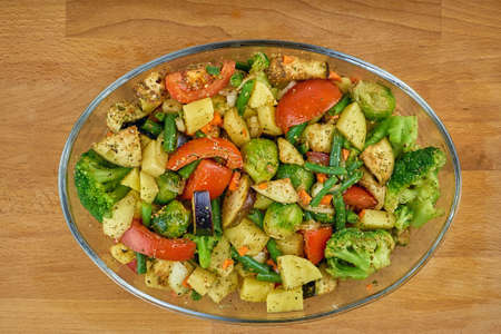 Vegetable stew in a transparent plate. Juicy vegetable stew in spices, top view. Vegetarian food, vegetable mix.