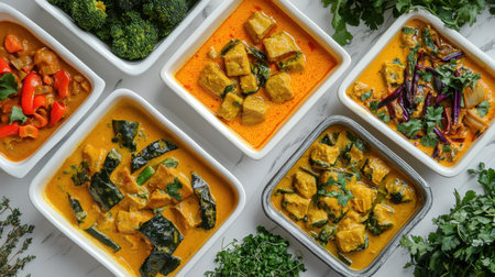 A vibrant collection of curry dishes featuring an array of vegetables, showcasing a delightful fusion of flavors and colors ideal for culinary enthusiasts and food photography.