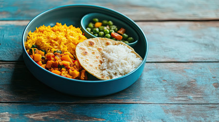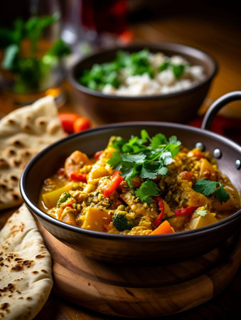 A vibrant bowl of spicy Indian curry filled with fresh vegetables, garnished with coriander and lemon, served alongside soft naan on a rustic wooden table.