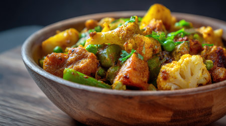 A vibrant vegetable medley featuring cauliflower, peas, and potatoes, beautifully arranged in a wooden bowl, topped with fresh herbs and spices.