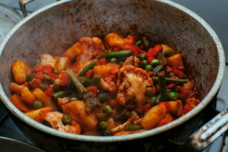 Vegetarian vegetable stew in tomato sauce, cooked in a pot