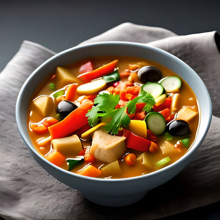 A vibrant bowl of vegetable soup featuring fresh herbs and spices. Perfect for showcasing healthy cooking, this colorful dish is ideal for food photography.