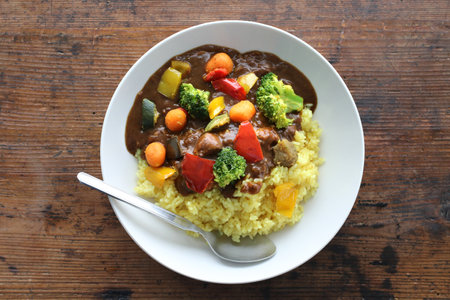 A steaming bowl of vegetable curry rice with Japanese curry sauce.
