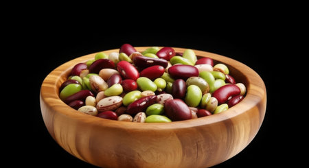 A close-up shot of a rustic wooden bowl overflowing with a vibrant mix of dried beans against a dark background.