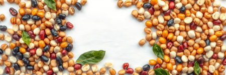 Variety of colorful beans arranged on a table with fresh green leaves enhancing the natural aesthetic
