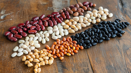 A vibrant collection of various beans arranged on a wooden surface, showcasing a diverse range of colors and textures ideal for cooking and nutrition.