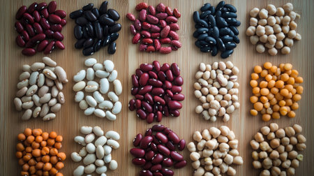 This image showcases a stunning display of various grains and pulses, featuring a rich palette of colors and textures, perfect for culinary inspirations.