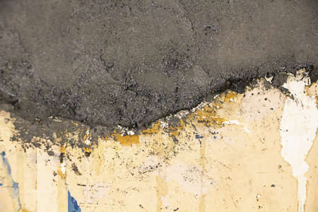 The worker mixes the mortar. Wet Concrete or motrar mixing texture. Gray mortar, concrete surface. The solution is stirred, apartment renovation.