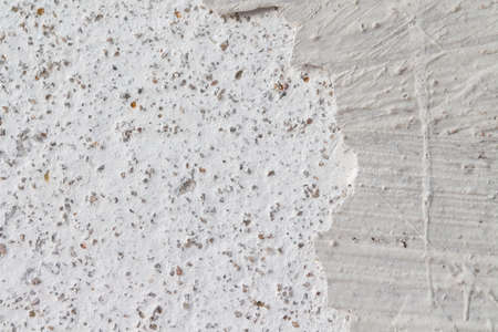 Grey plastered wall with white strip as creative abstract brutal background with copy space for your text, real stucco pronounced texture. Selective focus