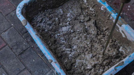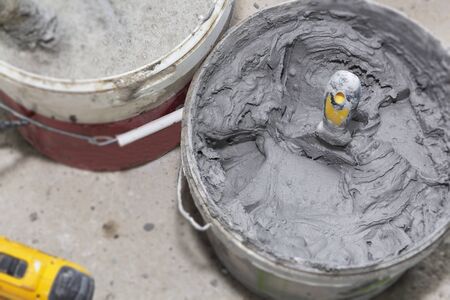 Mixing tile adhesive or cement with a power drill for repair works on construction site. Waiting to be mixed with cement. Construction workers or technicians is mixing the cement in the bucket.