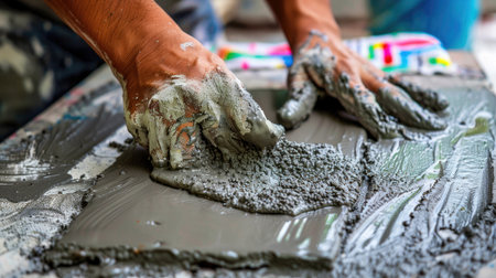 A close-up image showcasing hands skillfully spreading a fresh cement mixture on a surface. The hands reveal the texture and manual effort involved in construction.