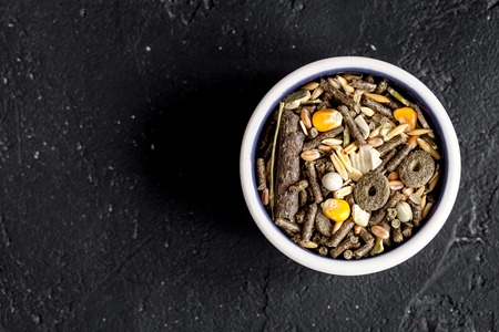 dry food for rodents in bowl on dark background top view.