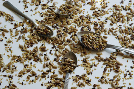 Top view of toasted mix of seeds - sunflower, lin and sesame seeds. Small amount- many proteins for healthy eating