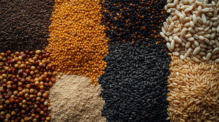 Raw Whole Grain Texture A close shot of raw whole grains tered on a smooth surface with different shapes and colors blending together showcasing their natural state..