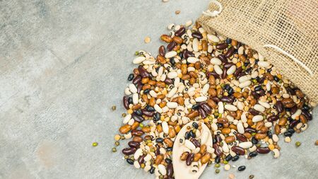 Sack of mix beans spill beans with beans on concrete table.